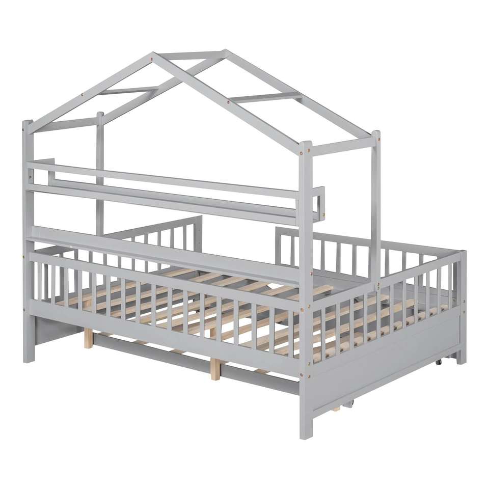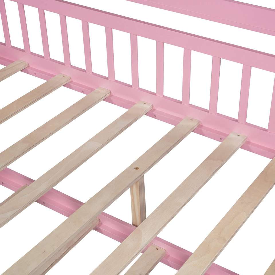 Letto a castello in legno a grandezza naturale con tetto, scaffale e ruote estraibili, adatto per camerette di bambine o bambini