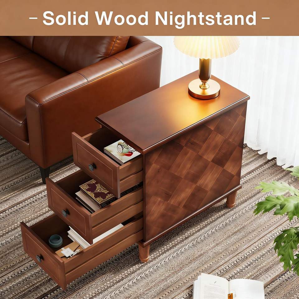 Comodino stretto a 3 cassetti in legno, completamente assemblato, con stile premium