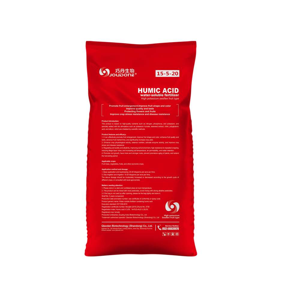 Composizione NPK 15-5-20: Fornisce un rapporto di nutrienti equilibrato che promuove l'ingrossamento del frutto, il colore e il rendimento complessivo delle colture.
