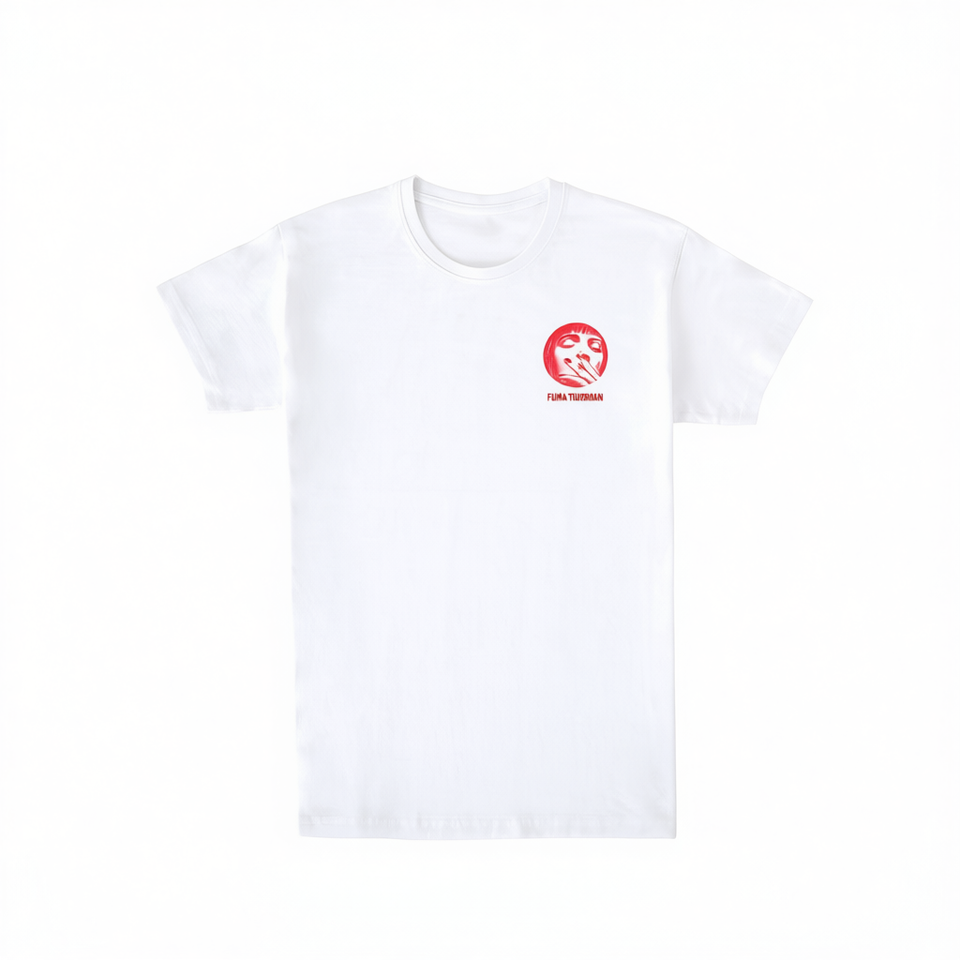 T-shirt bianca Fuma Thurman con logo rosso, abbigliamento promozionale