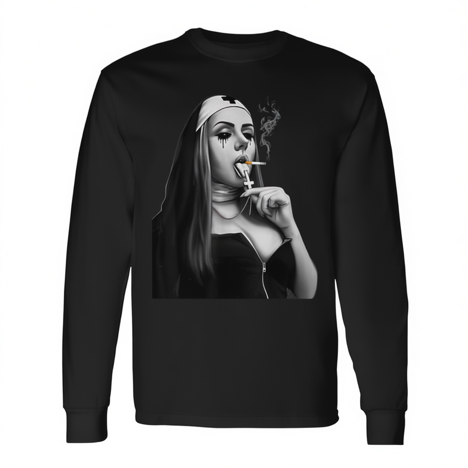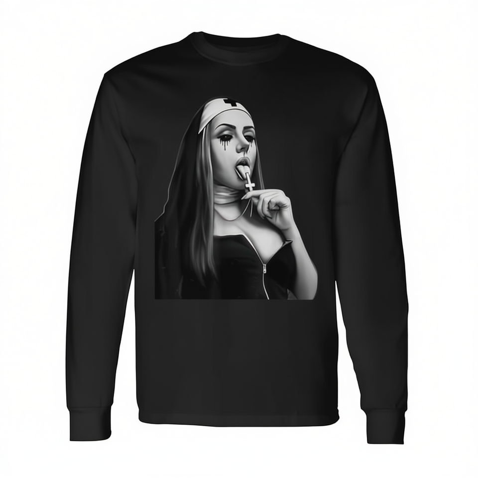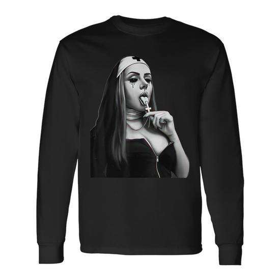 T-shirt promozionale a maniche lunghe con estetica religiosa Fun Bad Nun