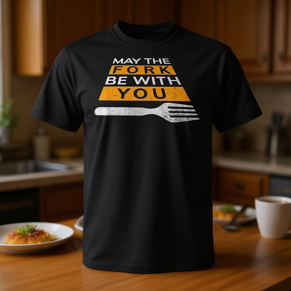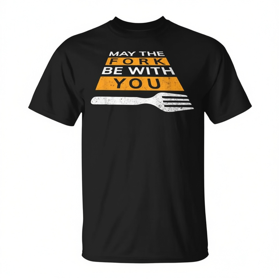 Divertente maglietta promozionale con la scritta 'May the Fork Be with You'
