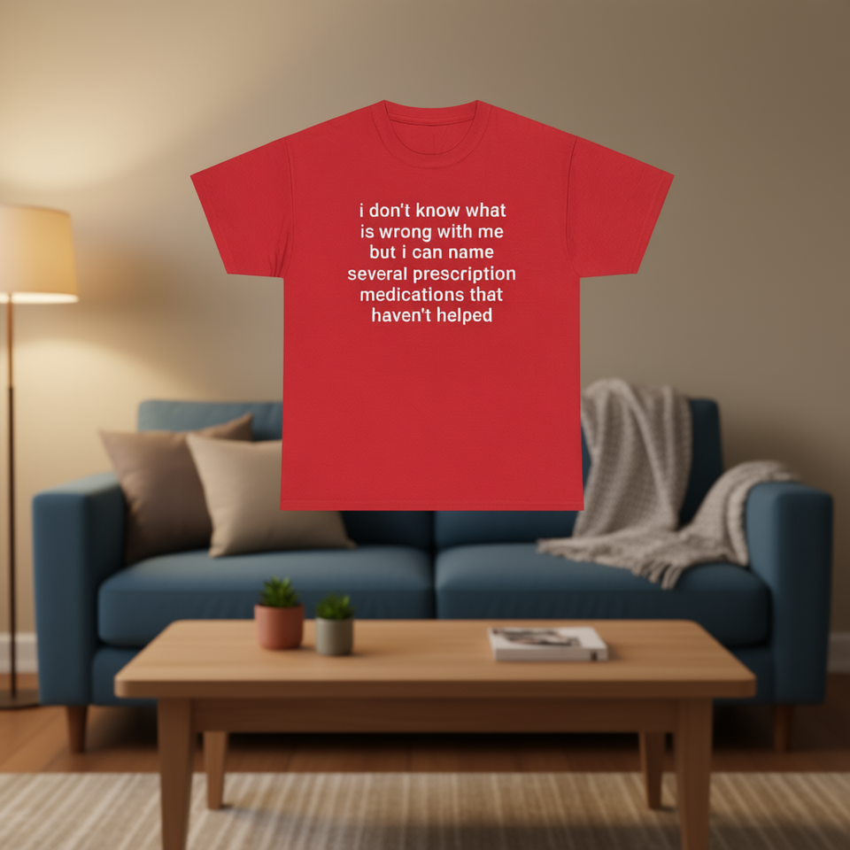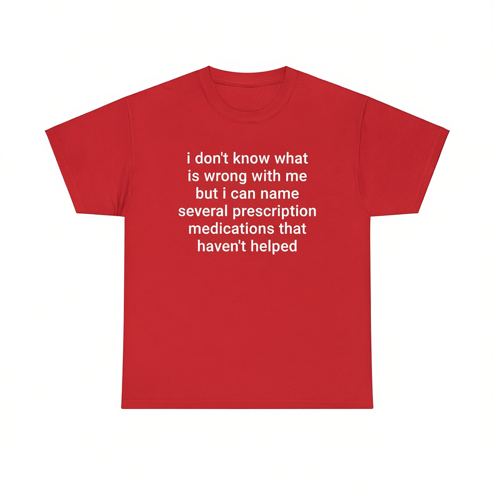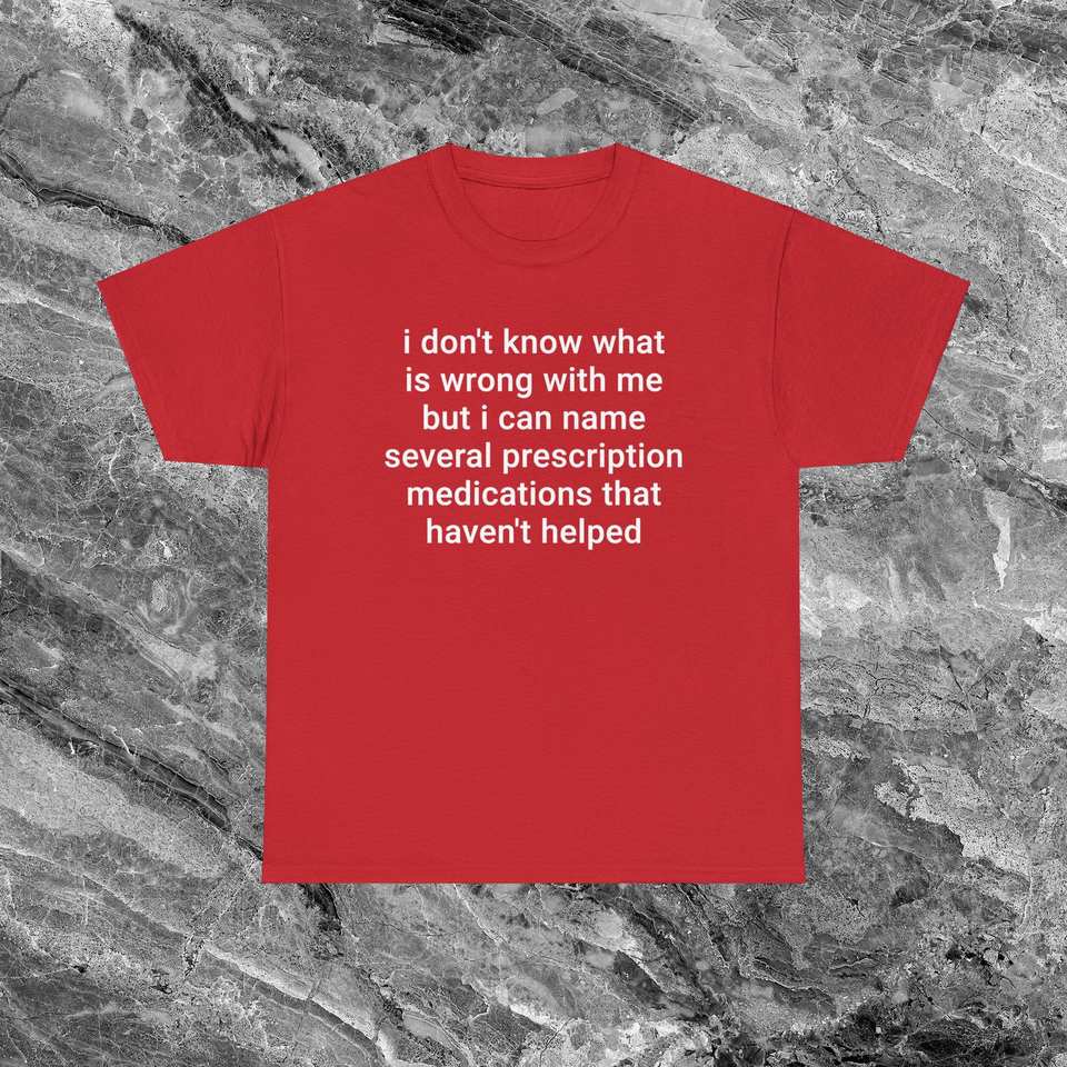 Divertente maglietta meme con testo sulle farmaci che non aiutano, maglietta rossa