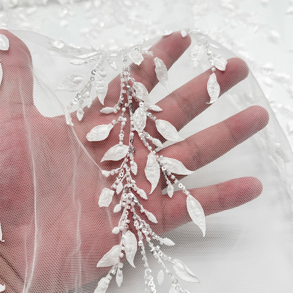 GCW-2410641-11 Pizzo ricamato con perle e foglie bianco avorio su tulle per abiti da sposa e haute couture
