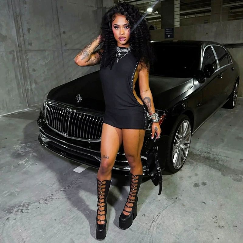 GHH12104- 2026 Nuovo Abito Corto Senza Maniche Sexy con Scollo Rotondo e Dettagli Traforati in Tinta Unita