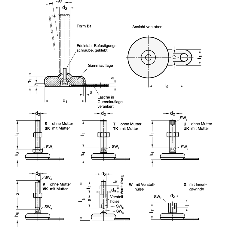 GN 33 Piedini Regolabili in Acciaio Inossidabile, con Pad in Gomma, con B