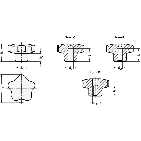 Dadi a maniglia a stella, piatti, con filettatura passante