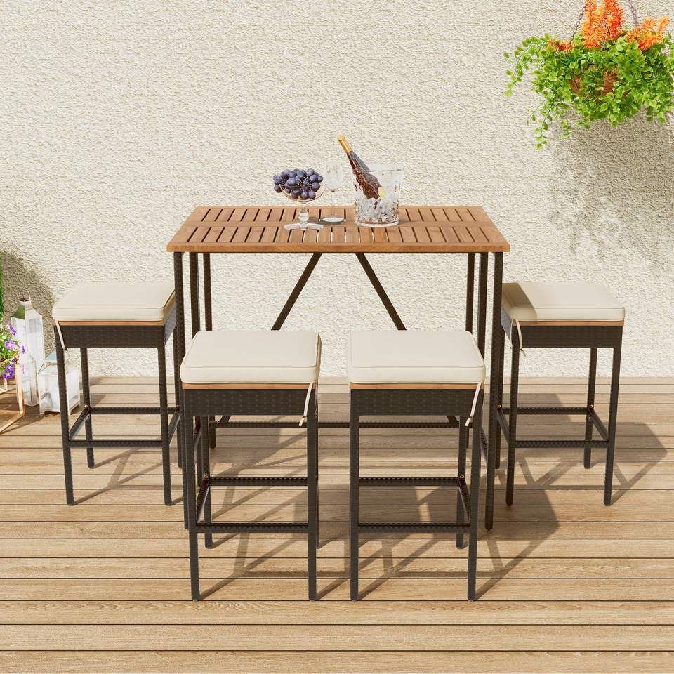 GO All-Weather Brown Patio Furniture Set 5-Piece Outdoor Acacia Wood Bar Table Four Stools Cushions Foldable Tabletop Set Garden