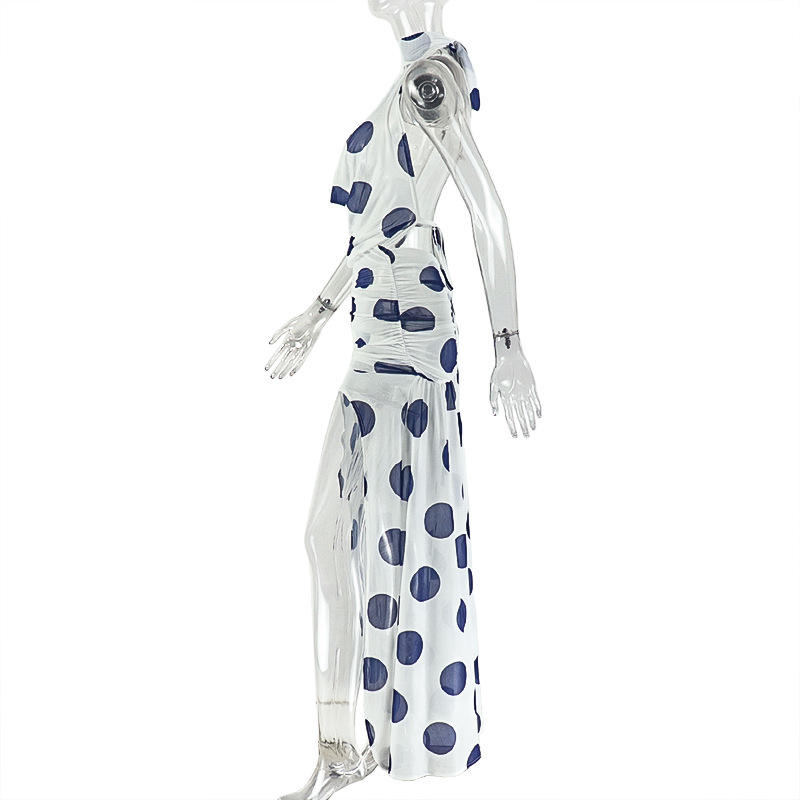 GX-2025 Black and White Polka Dot Women's Slit Printed Street-style Irregular Skirt with High Collar, Lace-up, Backless Dress