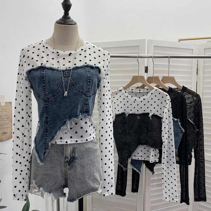 T-shirt a maniche lunghe con frange irregolari in Denim GX-Plaid a rete in tessuto per snellire il corpo