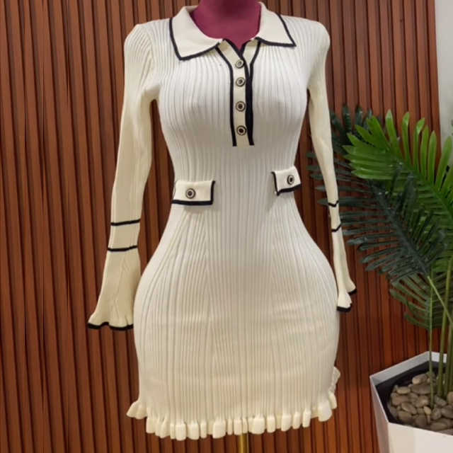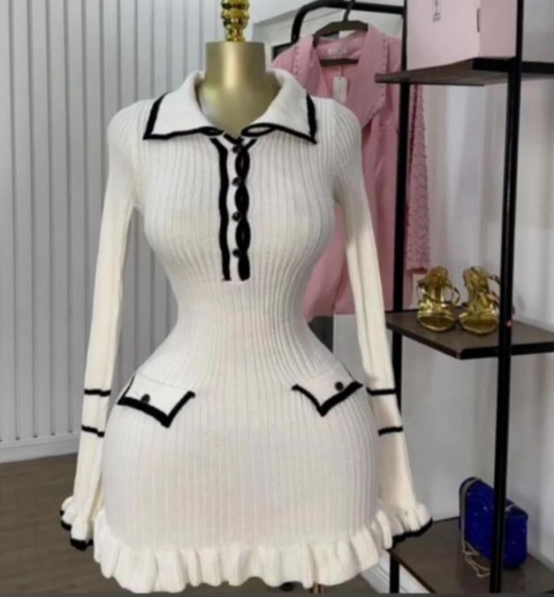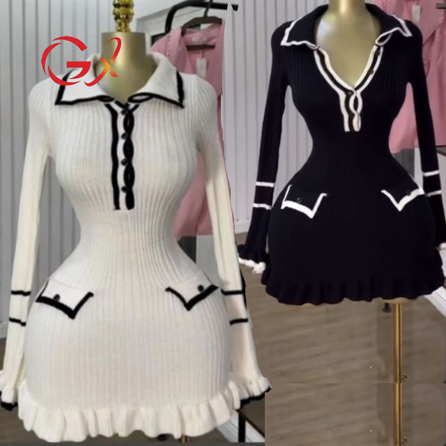 GX2200A Fashion Spring Autumn Casual Dress Color Patchwork Lapel V-Neck Long Flare Sleeve Slim Fit Knitted Evening Mini Dresses