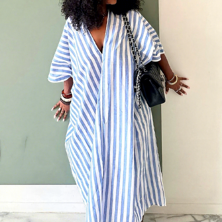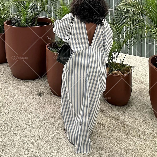 GX7245A Fashion Clothing Boutique Stripped Printed Short Sleeve Loose Long Dress Elegant Backless V-neck Maxi Dresses