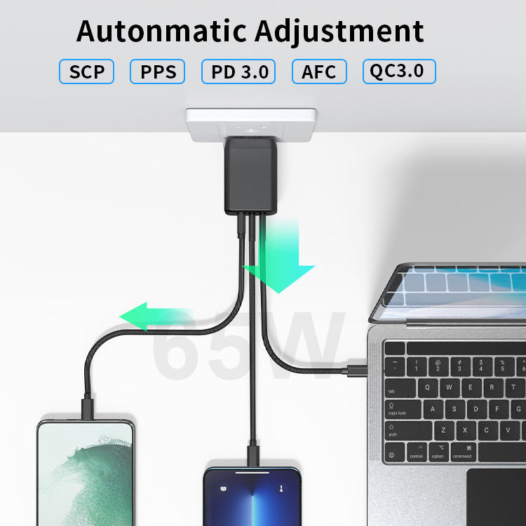 Potenza di uscita 65W: Fornisce 65W di potenza, garantendo una ricarica rapida per una vasta gamma di dispositivi, inclusi laptop, smartphone e tablet.