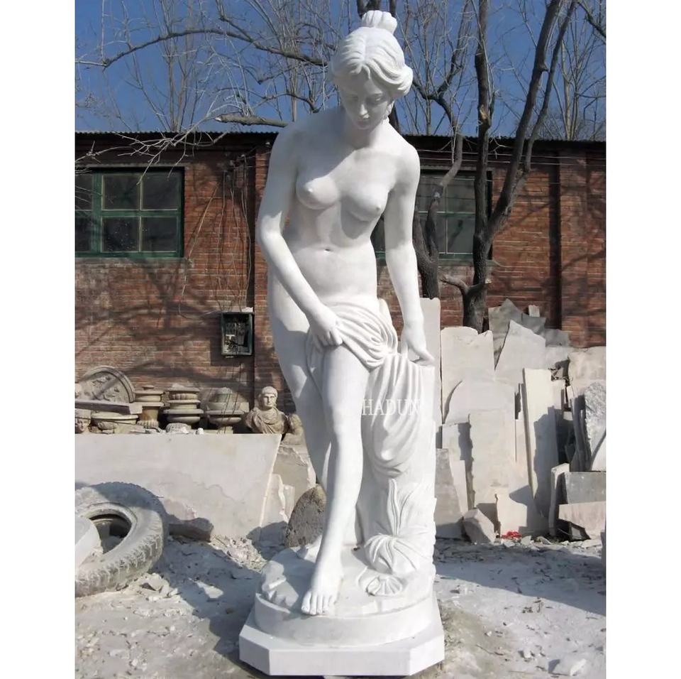 Venus di balneazione in pietra bianca a grandezza naturale del giardino con la statua della mela