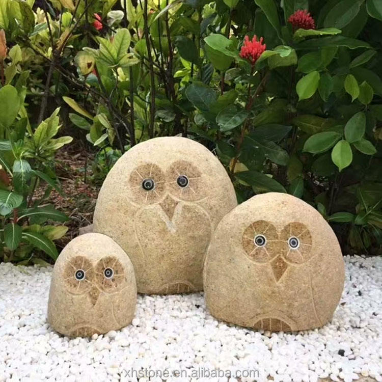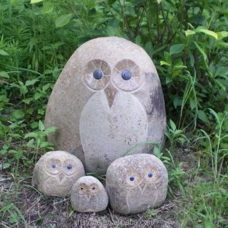 Garden Outdoor Decoration Ornaments Natural River Rock Pebble Cobble Stone Carved Small Owls Family Mother and Child Statue