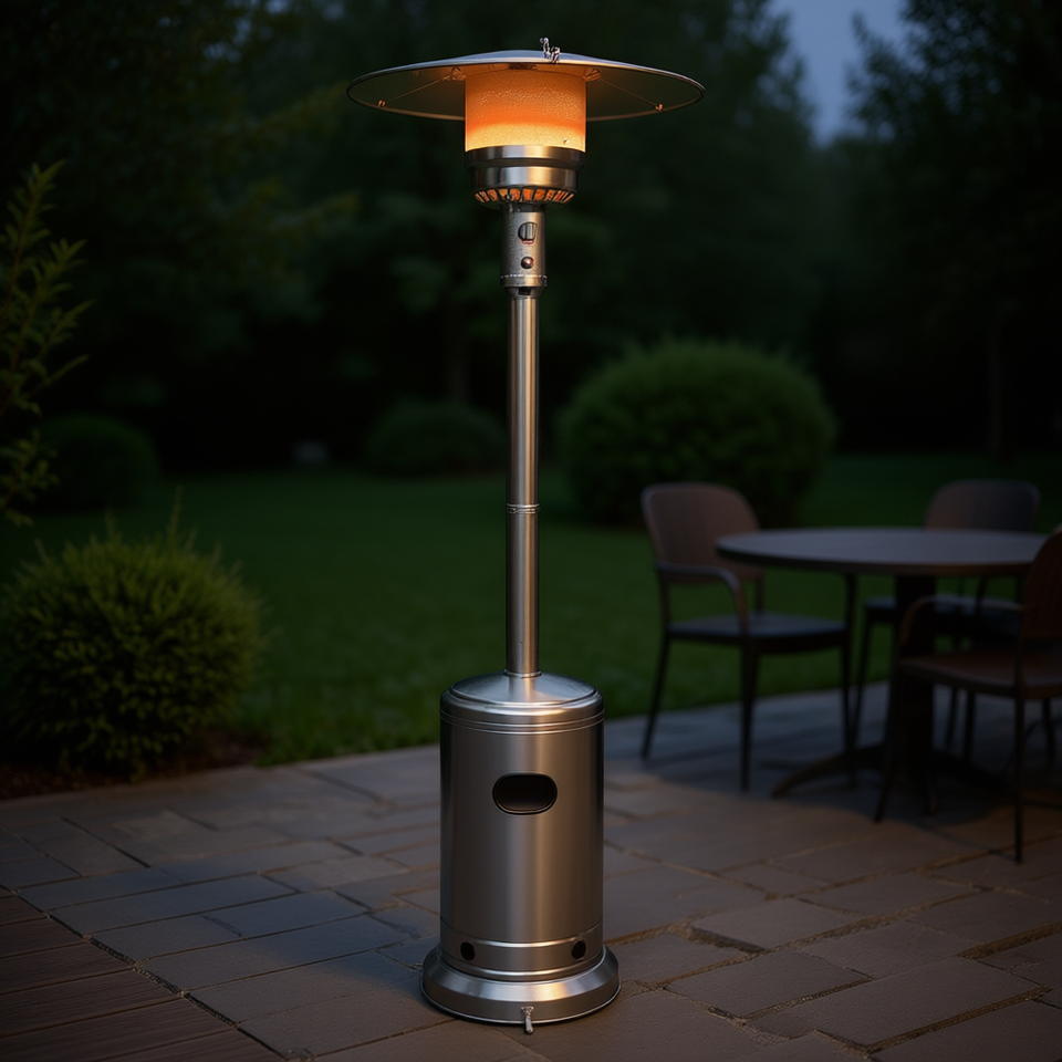 Riscaldatore da Esterno a Gas GPL da Giardino, in Acciaio Argentato, Regolabile con Accensione Piezoelettrica, Design Moderno Rotondo