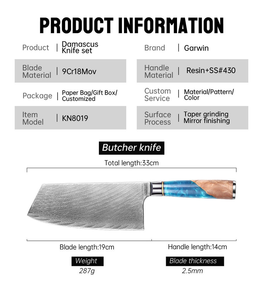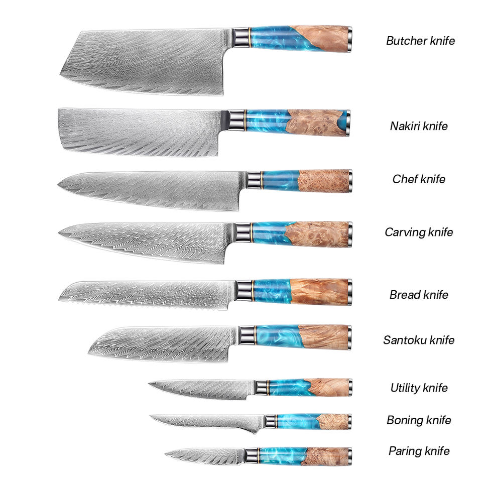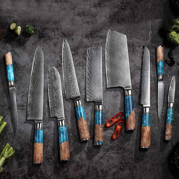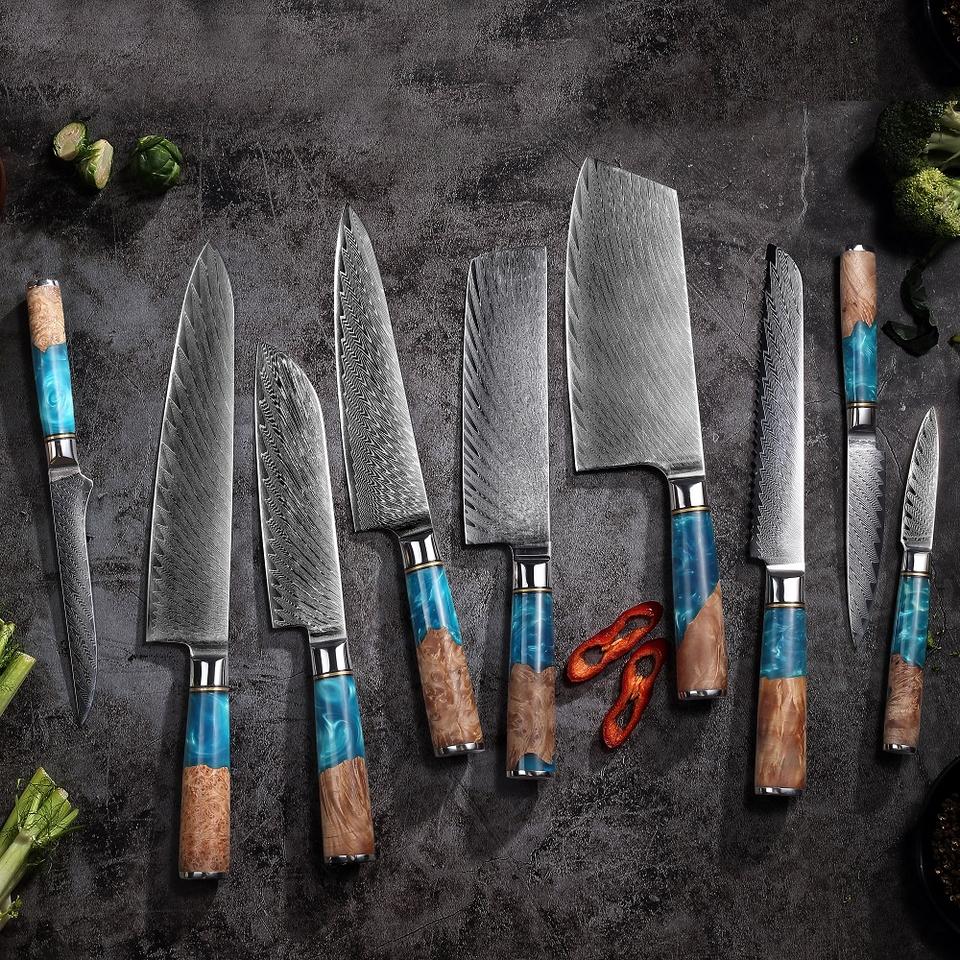 Set di 9 coltelli da cucina Garwin in acciaio Damasco VG10, coltelli da macellaio, Nakiri, Chef, da intaglio, Santoku, da sbucciatura, da pane, multiuso, da disosso, ambidestri