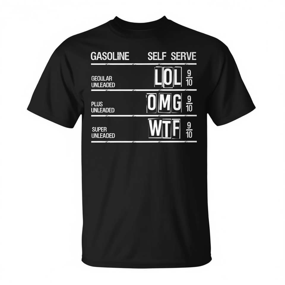 T-shirt Gasoline Self Serve LOL OMG WTF dal design sarcastico sui prezzi dell'olio