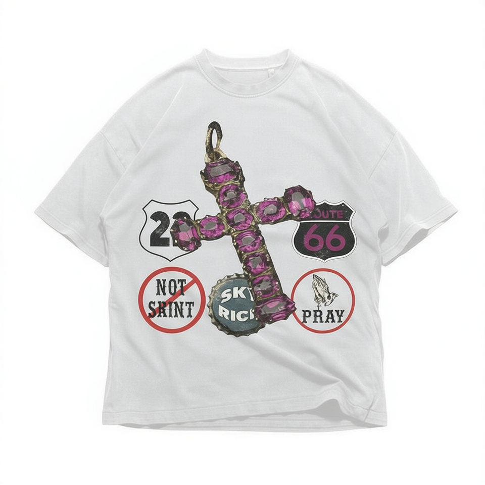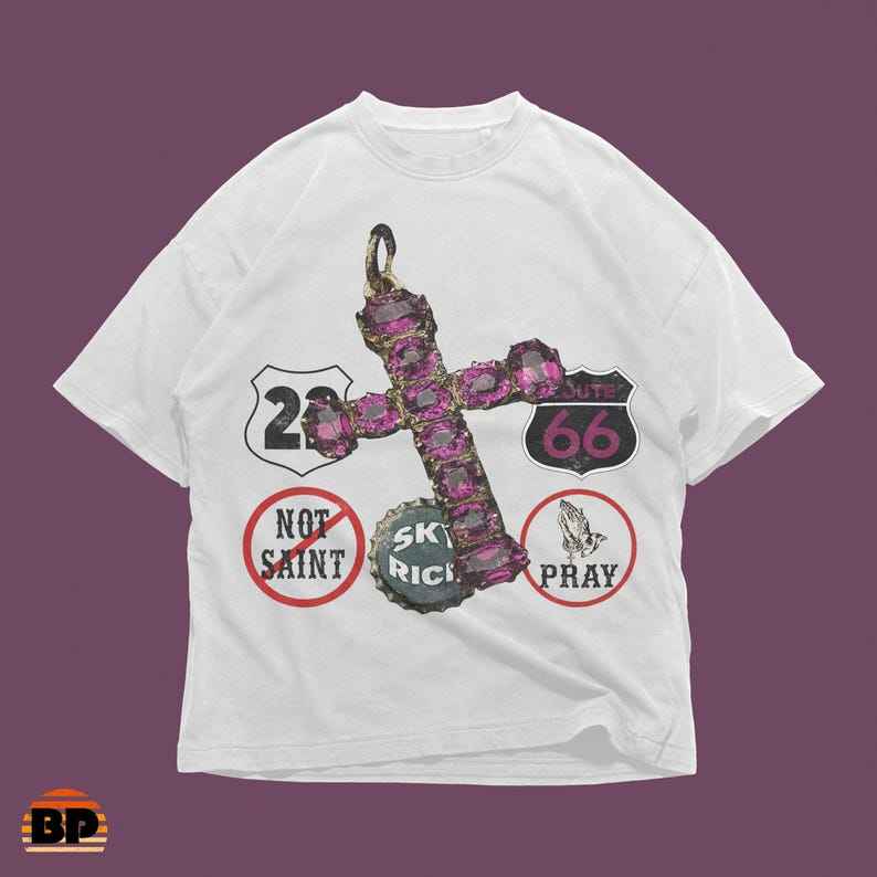 T-shirt Oversize Y2K Goth Streetwear con Grafica Chrome Punk 'Not Saint Pray Rebel' e Croce con Gemme Route 66