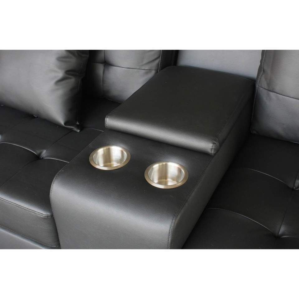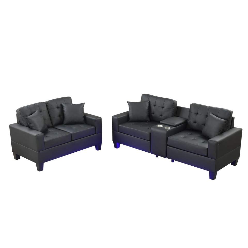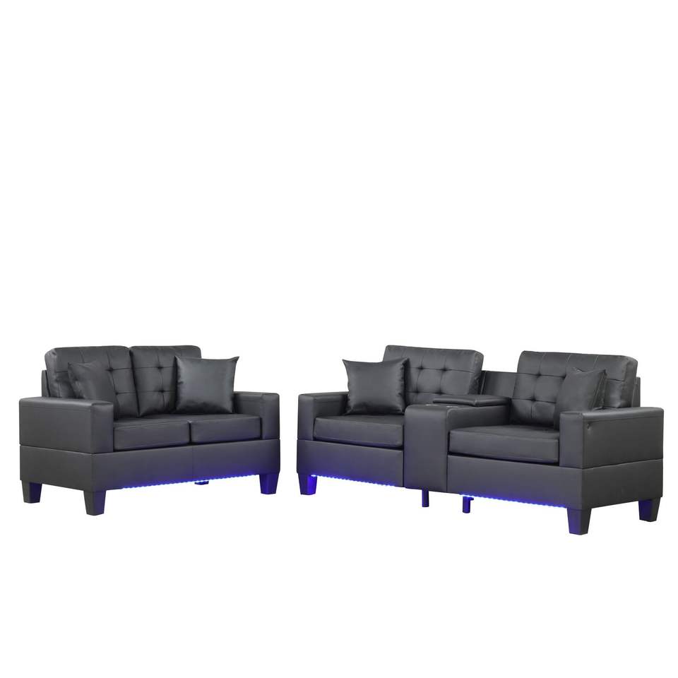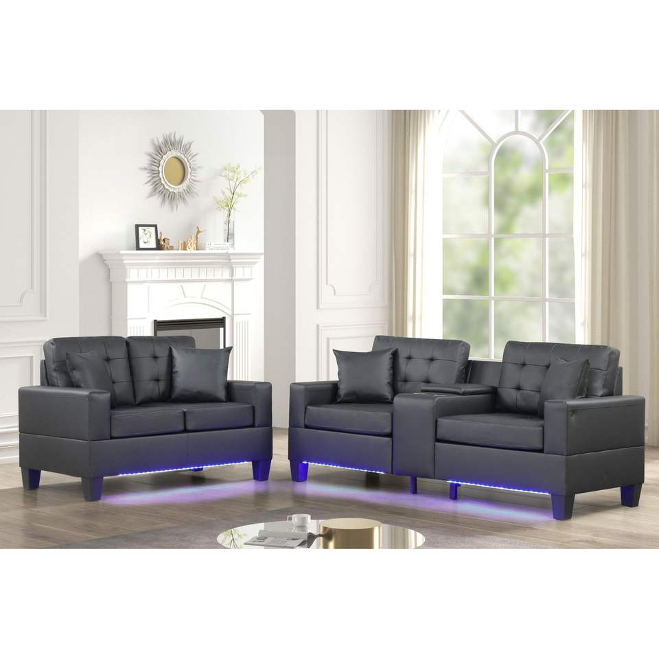 Set Divano e Poltrona Genesis Trapuntati in Tessuto PVC Nero con Luci LED, Caricatore USB, Console Portaoggetti e Portabicchieri - per Soggiorno