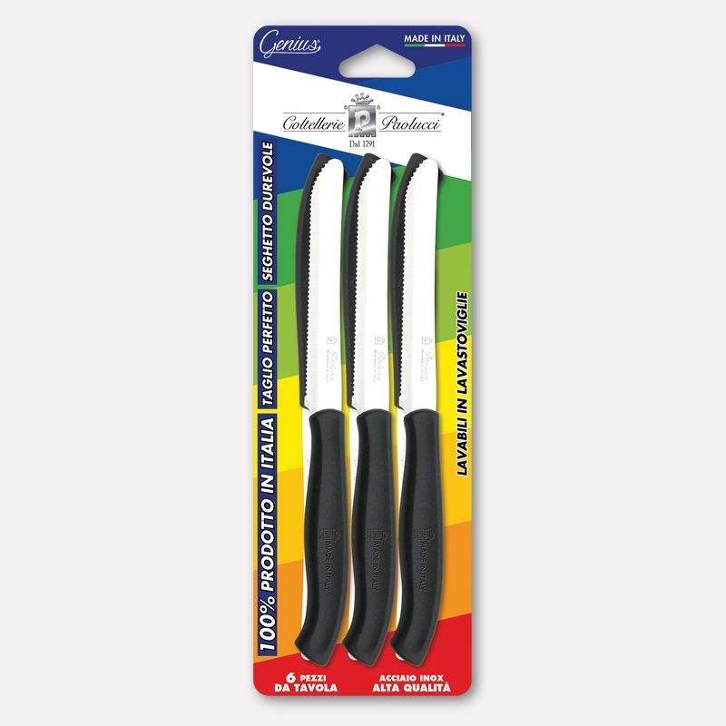 Set di 6 Coltelli da Tavola Genius 11 Cm, Lama Seghettata in Acciaio Inox con Manico Nero, Made in Italy