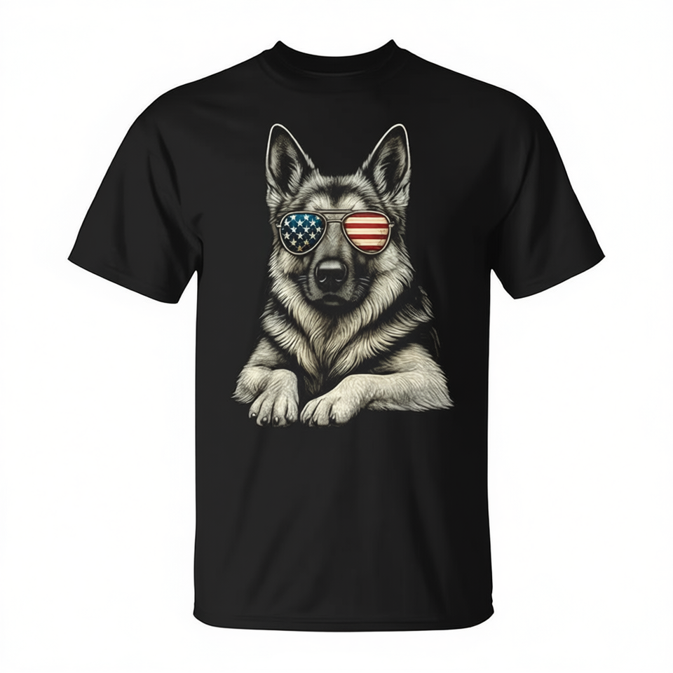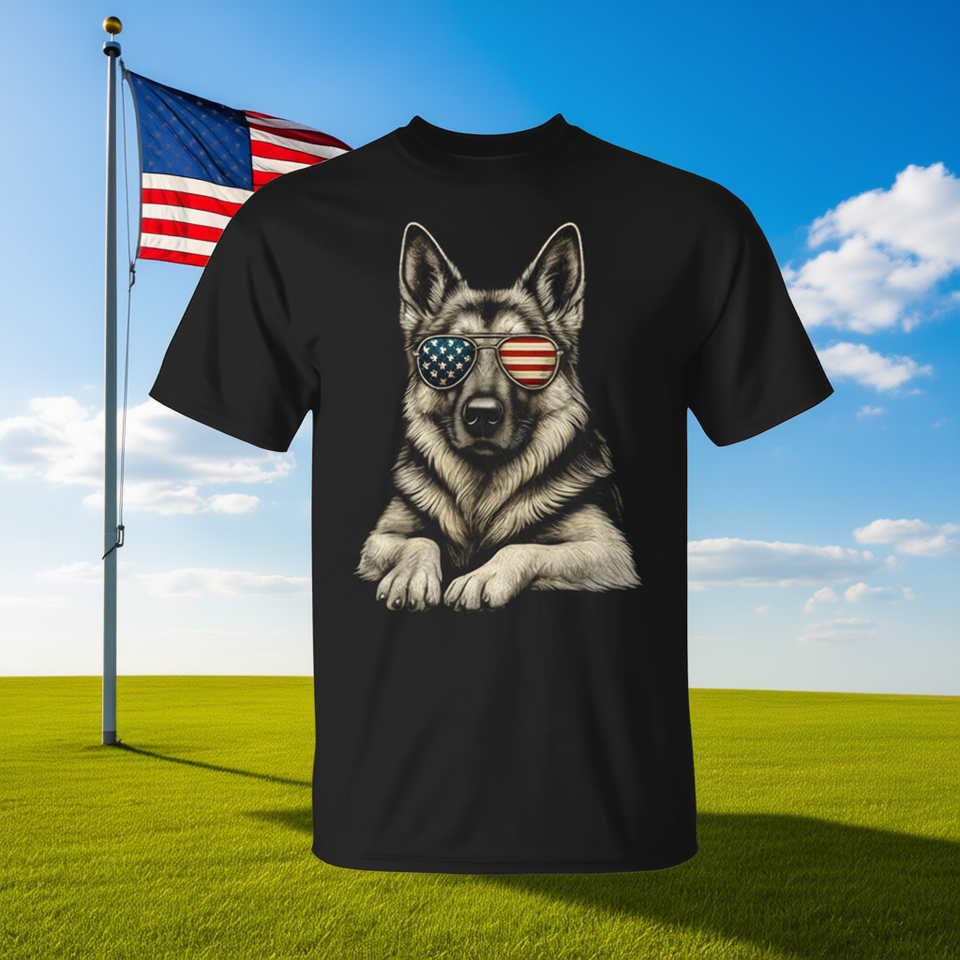 T-shirt con occhiali da sole con bandiera degli Stati Uniti per cani da pastore tedesco, design patriottico