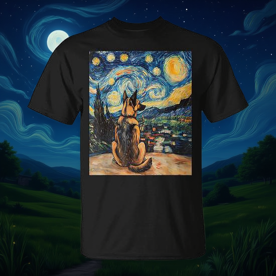 T-shirt con cane pastore tedesco in stile Notte stellata di Van Gogh - per gli amanti dei cani e degli animali