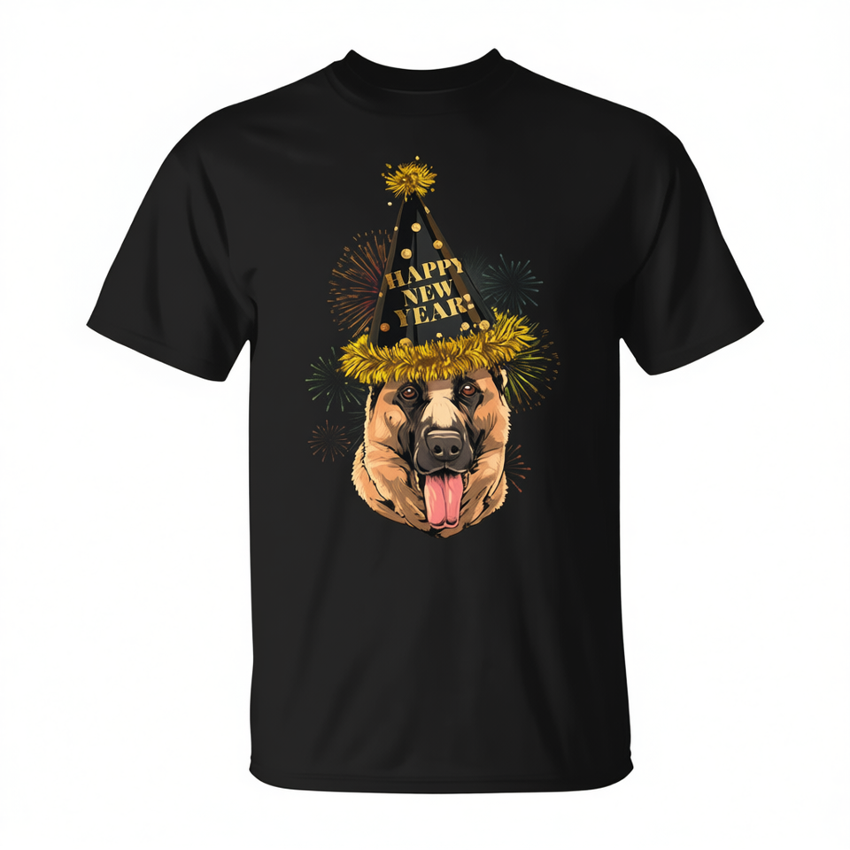 T-shirt da festa per cani con scritta Happy New Year del pastore tedesco, nera, per adulti, unisex