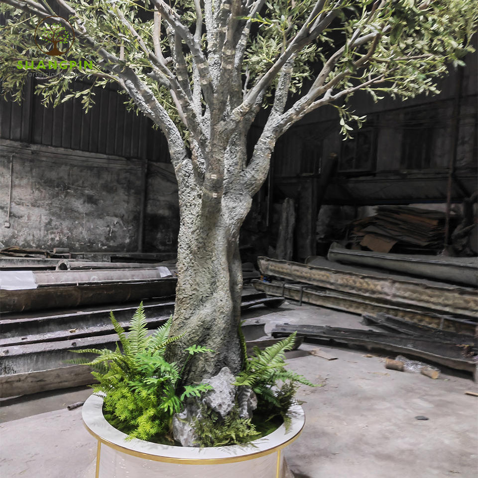 Ulivo Artificiale Gigante con Vaso Bianco e Felci alla Base