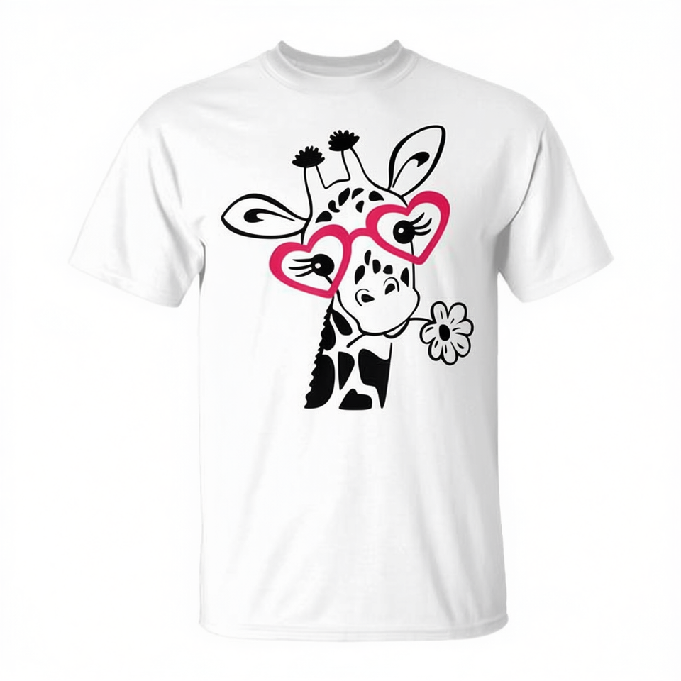 T-shirt con giraffa e occhiali a cuore rosso, girocollo unisex per adulti, manica corta, stampa digitale, per attività promozionali