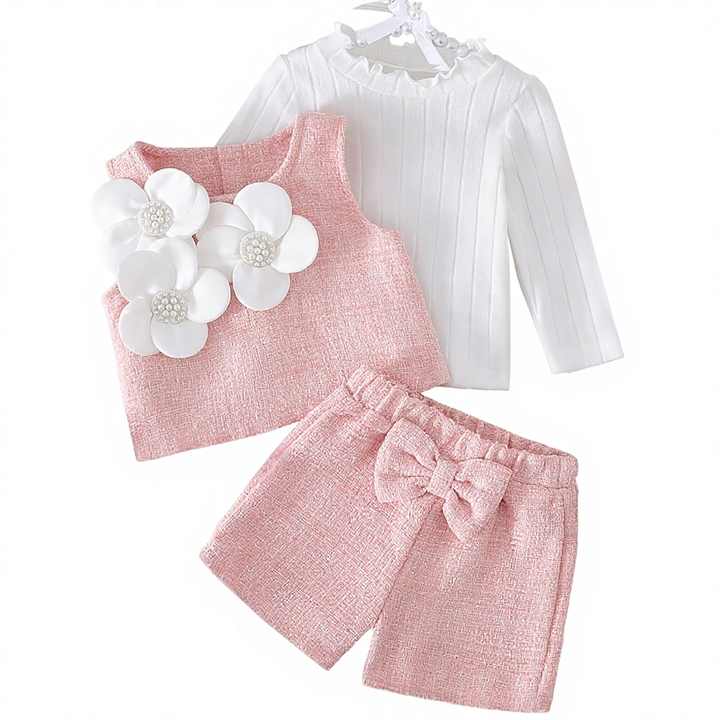 Set autunno/inverno per bambina: t-shirt a righe + gilet a fiori + pantaloncini decorati con fiocco
