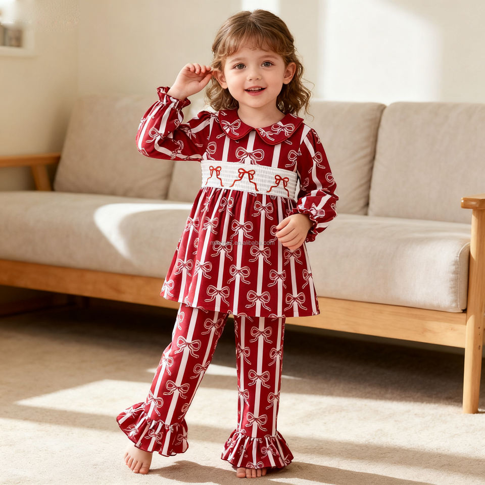 Girls Clothing Bow Smocked Baby Clothes Cute Little Bear Printed Girls' Long-sleeved Dress Set