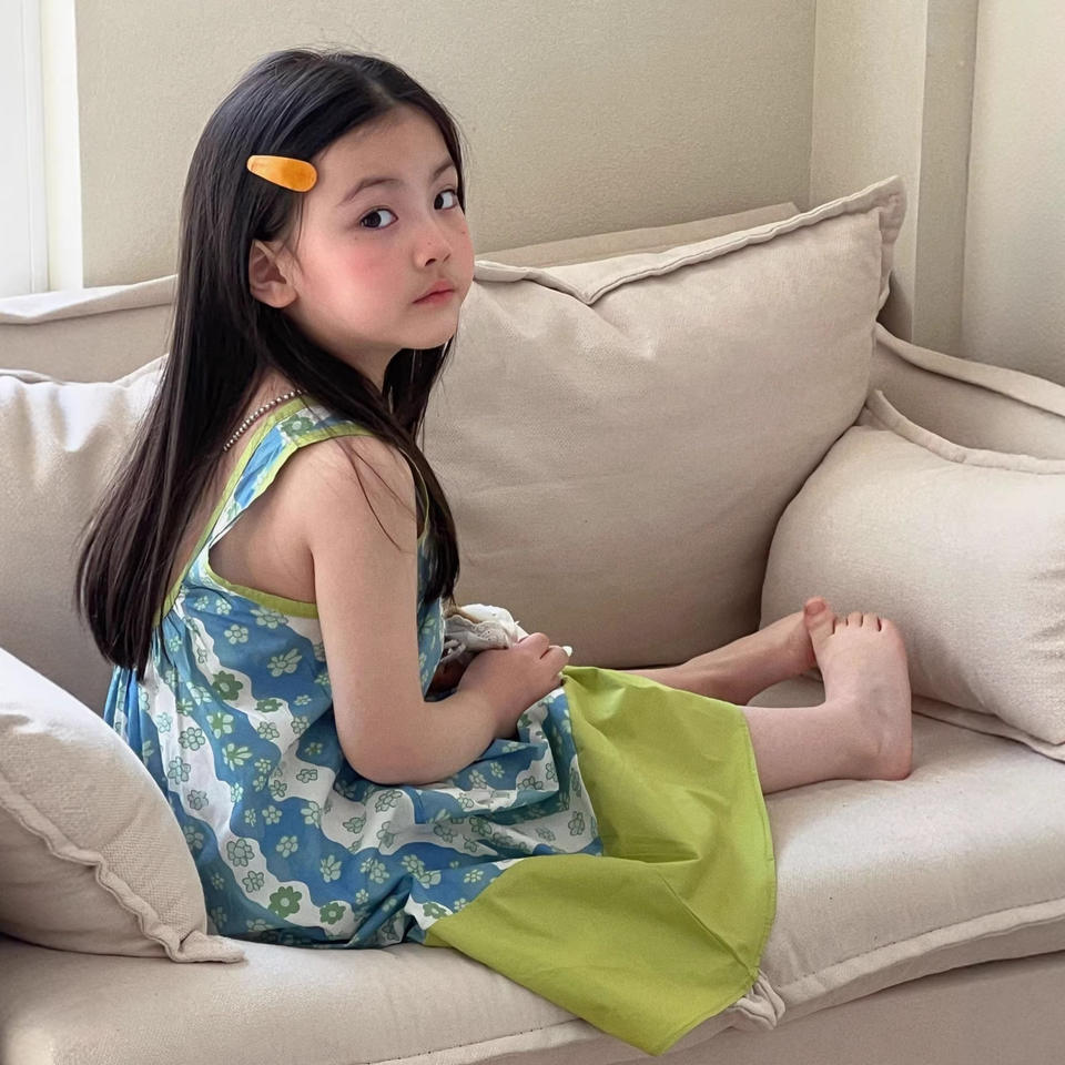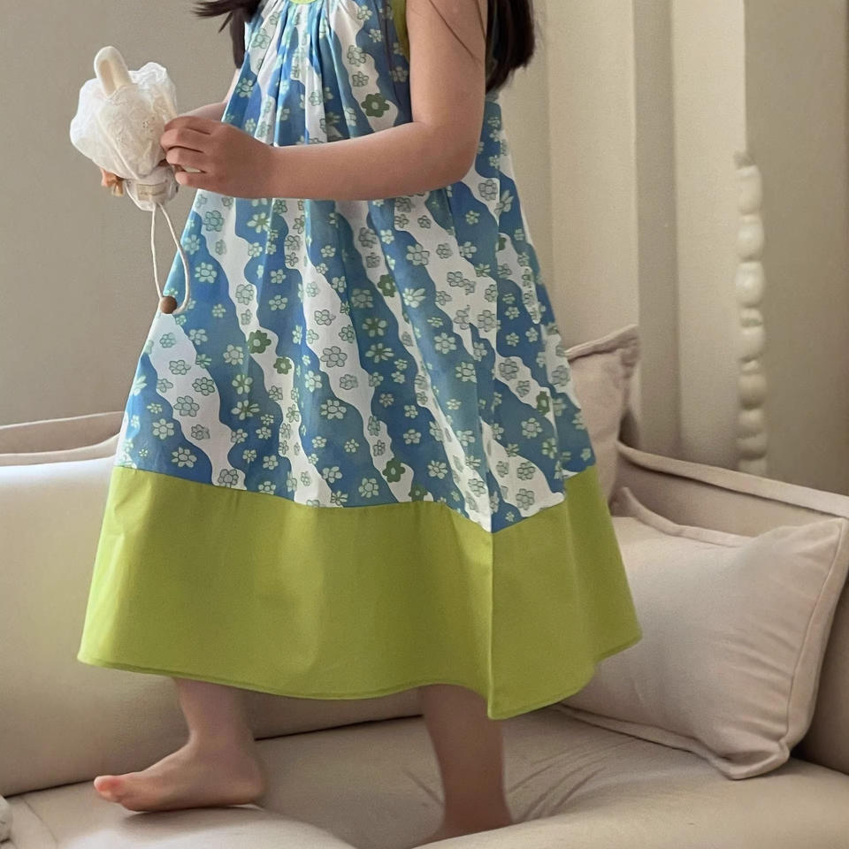Abito estivo in cotone per ragazze, color block, scollo quadrato, senza maniche, stile country