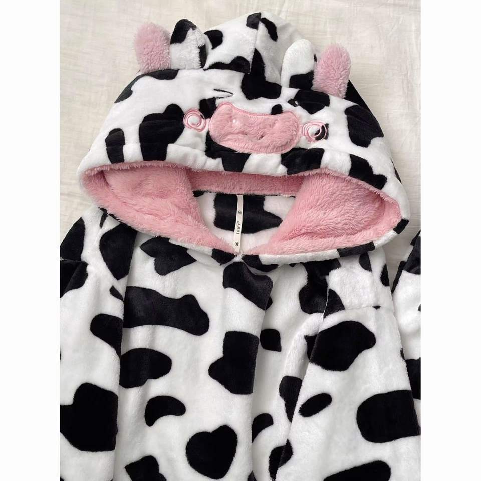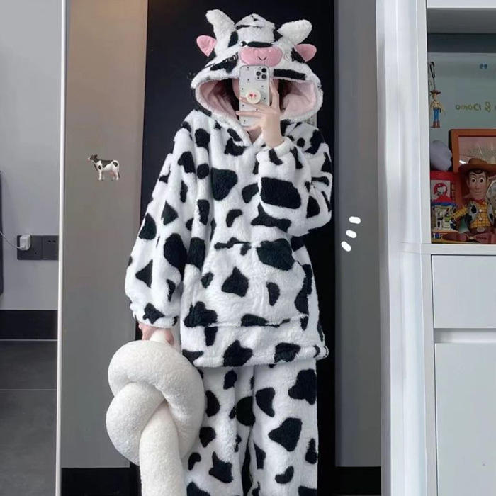 Girls' Cute Cow Hooded Flannel Pajamas Women's Winter New Plush Thick Plush Home Clothing Set 2 Psc for Women
