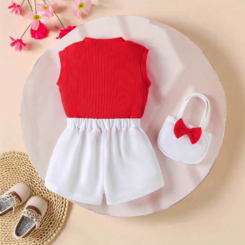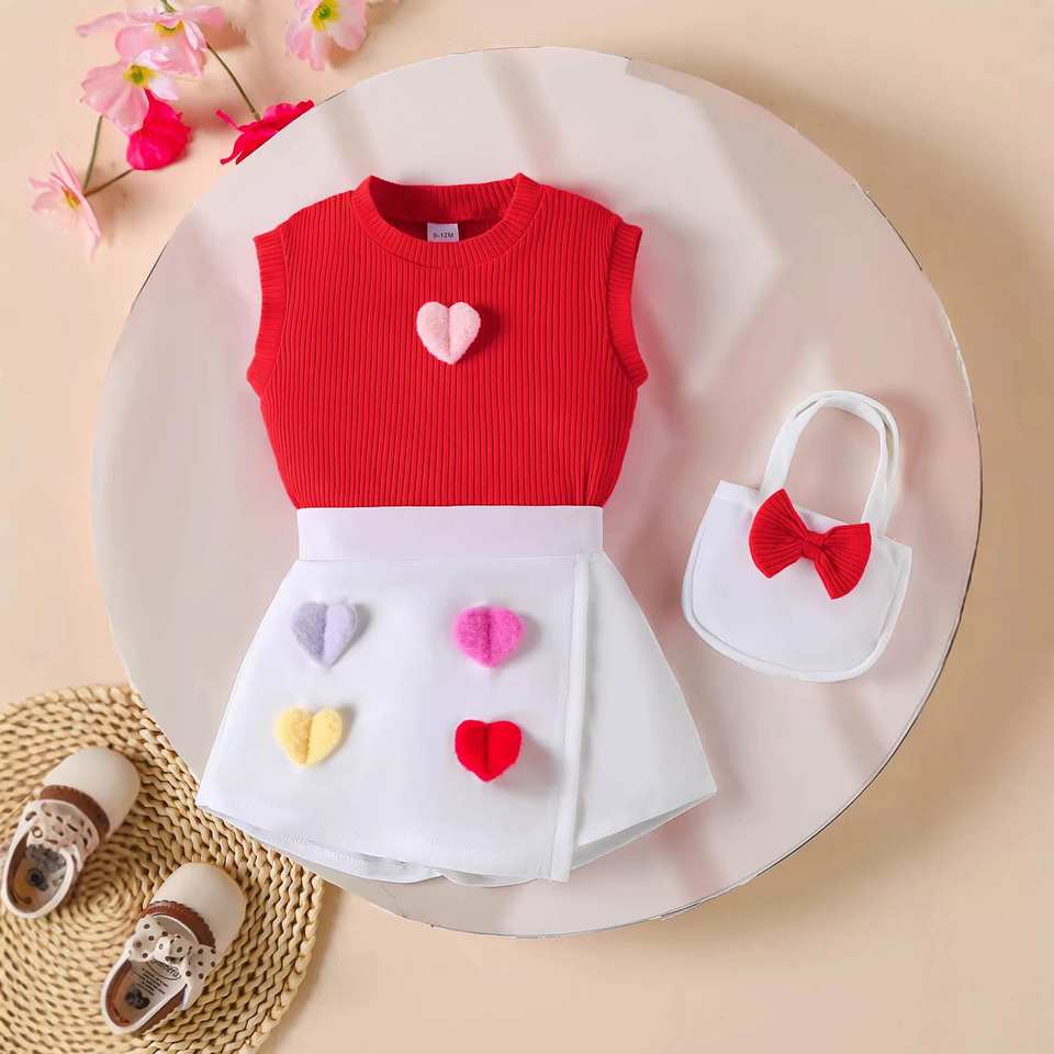 Set Tre Pezzi per Ragazze: Top Senza Maniche a Costine con Motivo Cuori, Gonna Bianca con Cuori Colorati, Borsa - Outfit Casual Carino