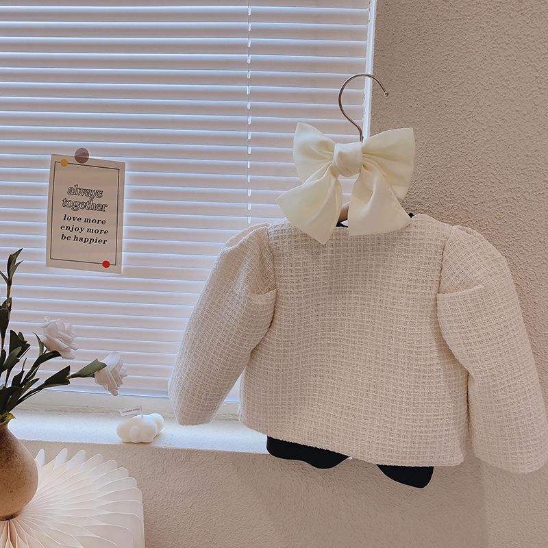 Completo autunnale per bambina, nuovo modello con fiocco, giacca e gonna a pieghe, due pezzi.