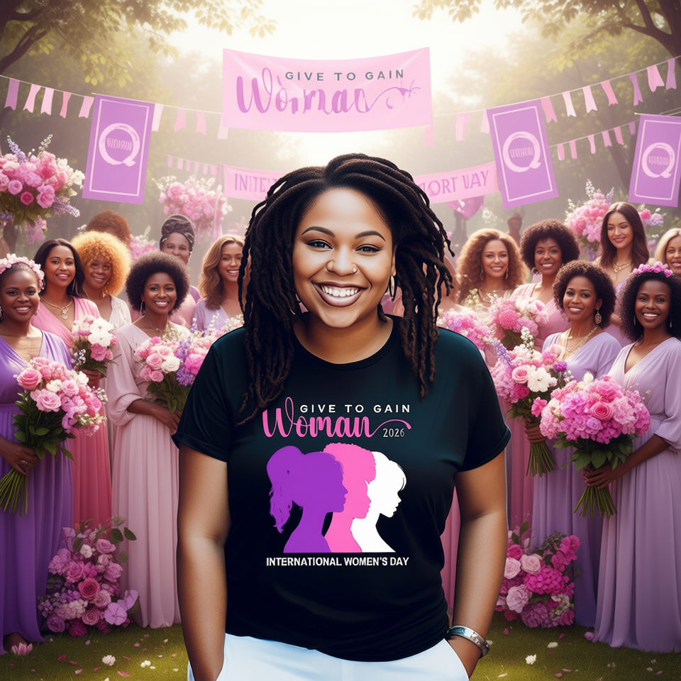 T-shirt da donna Give To Gain per la Giornata Internazionale della Donna 2026, casual, girocollo, a maniche corte, in jersey stampato 100% cotone