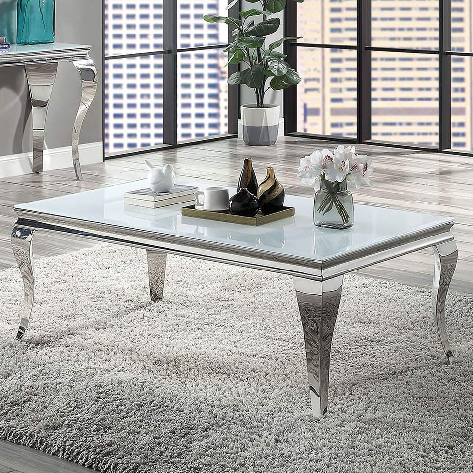 Glamorous Contemporary 1-Piece Coffee Table White Glass Top Stainless Steel Cabriole Style Legs Silver Color for Living Room