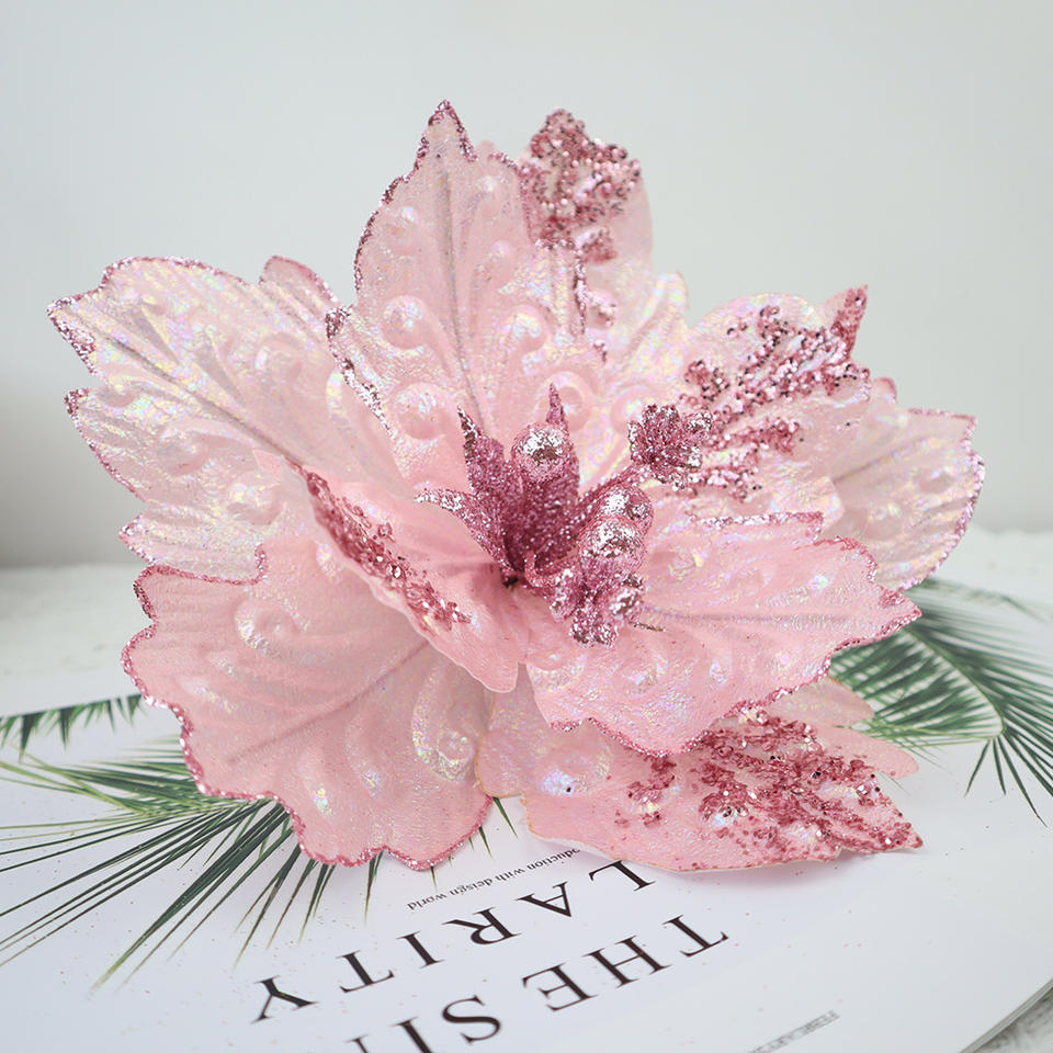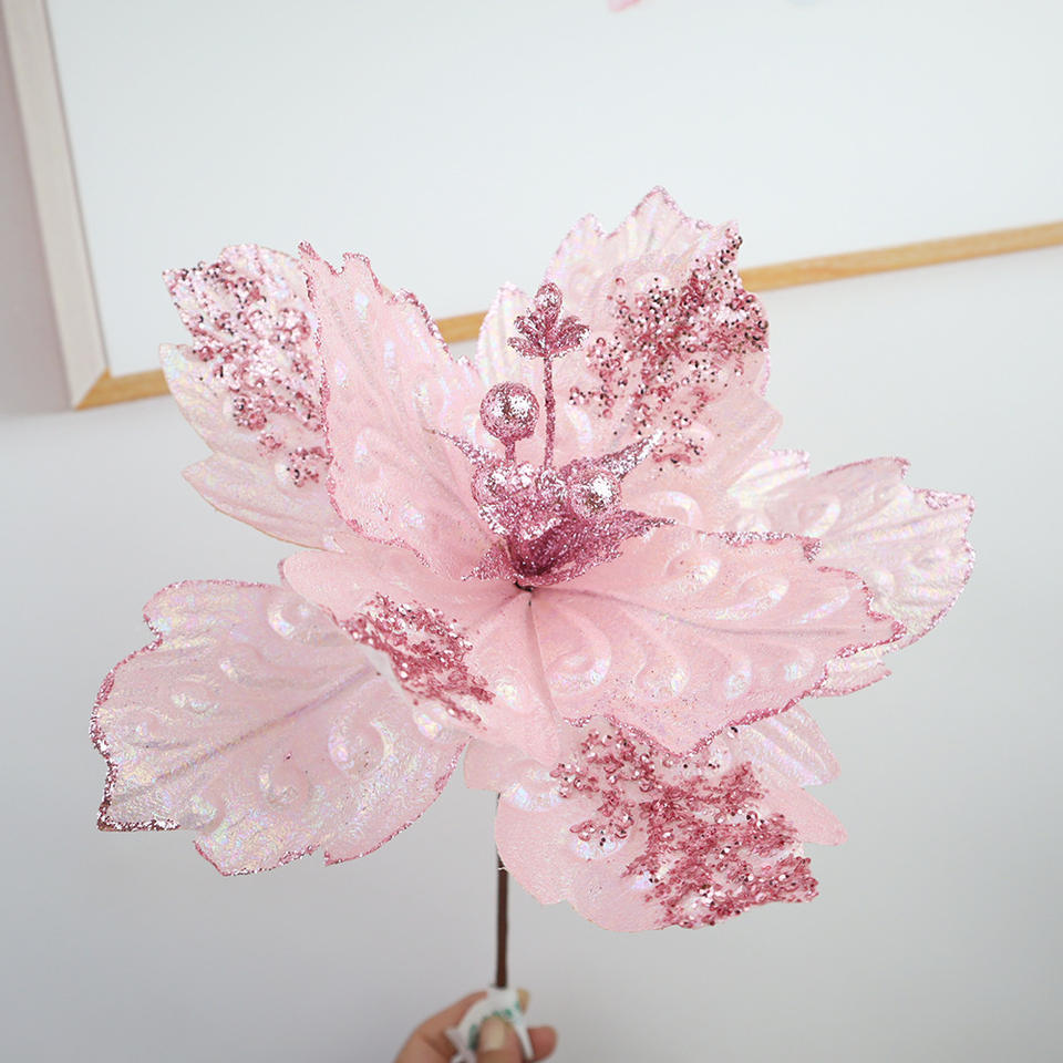 Glitter Artificial Silk Rose Pink Christmas Flowers Waterproof Handmade Modern Merry Christmas Tree Decoration Home Decor