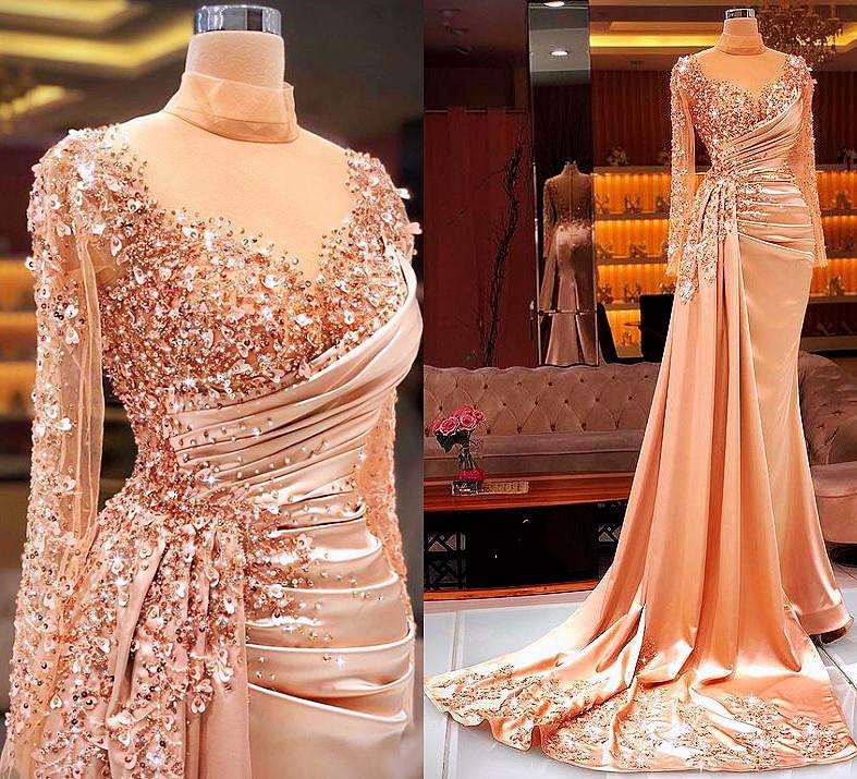 Abiti da Sera di Lusso Glitterati Stile Dubai Sirena Scintillante con Spacco Laterale Manica Lunga Arabia 2025 Arancioni da Cerimonia e Ballo MP620