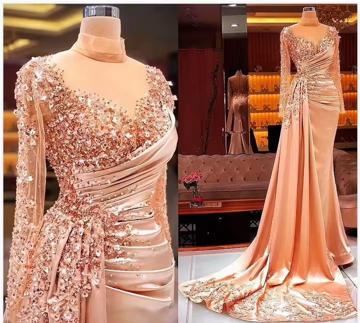 Glitter Luxury Evening Dresses Dubai Shiny Mermaid Side Split Long Sleeve Arabia 2025 Orange Party Gowns Prom Dress