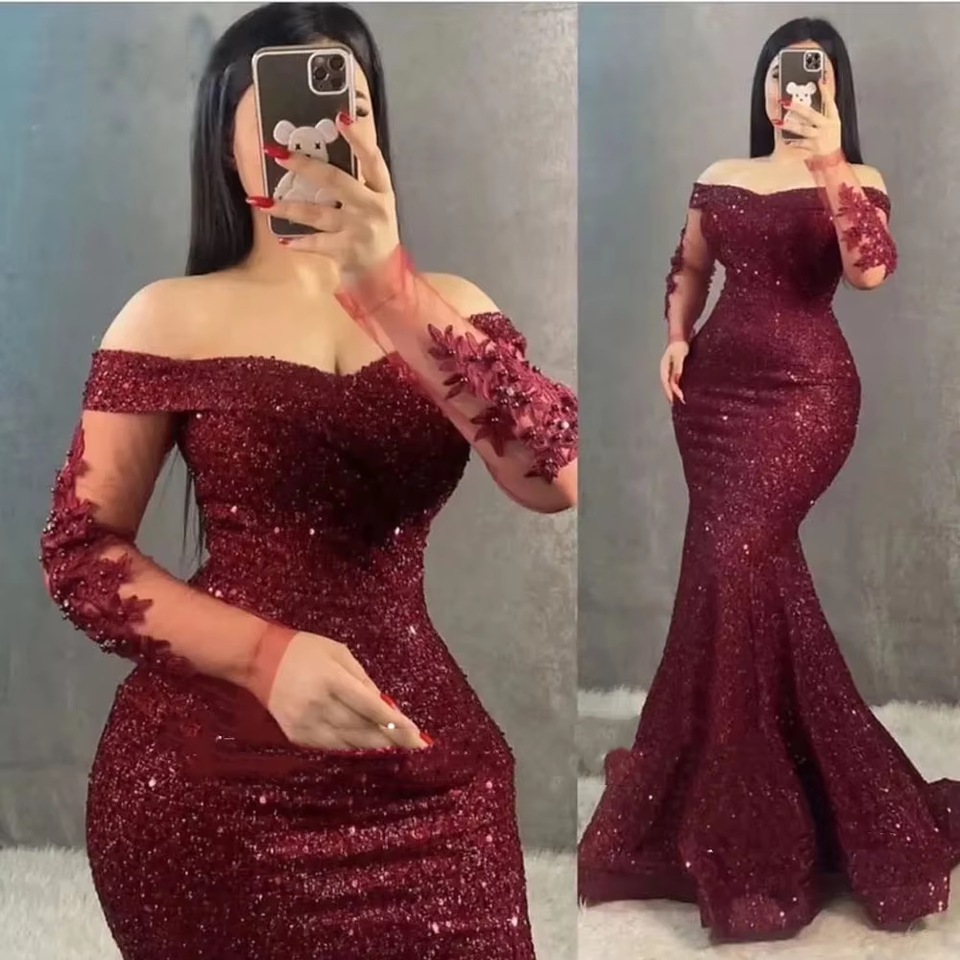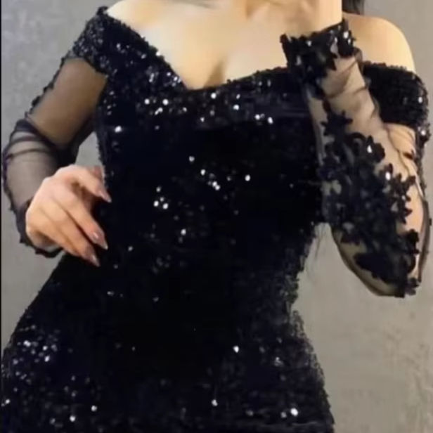 Glitter Sequins Mermaid Black Evening Dresses Off the Shoulder Long Sleeves 2026 Green Women Formal Night Party Gowns MP508