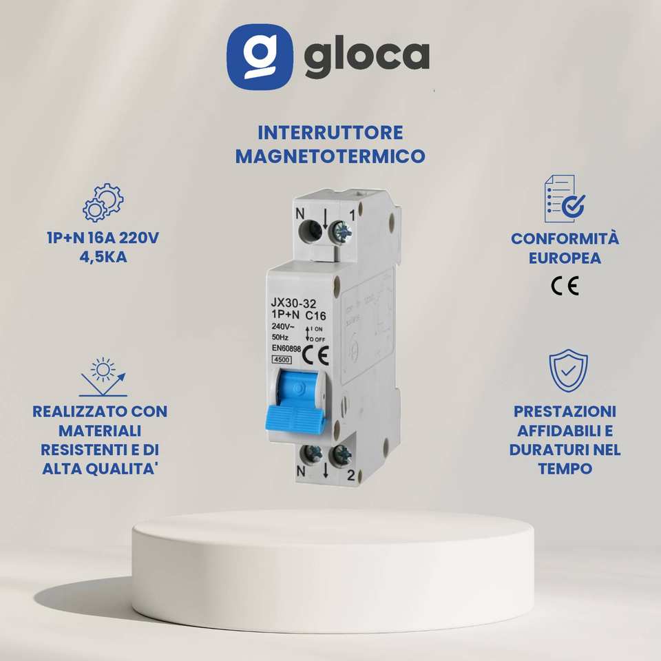Interruttore Automatico Miniaturizzato Gloca 1P+N C16 240V 50Hz 4.5kA Montaggio su Guida DIN per Uso Domestico