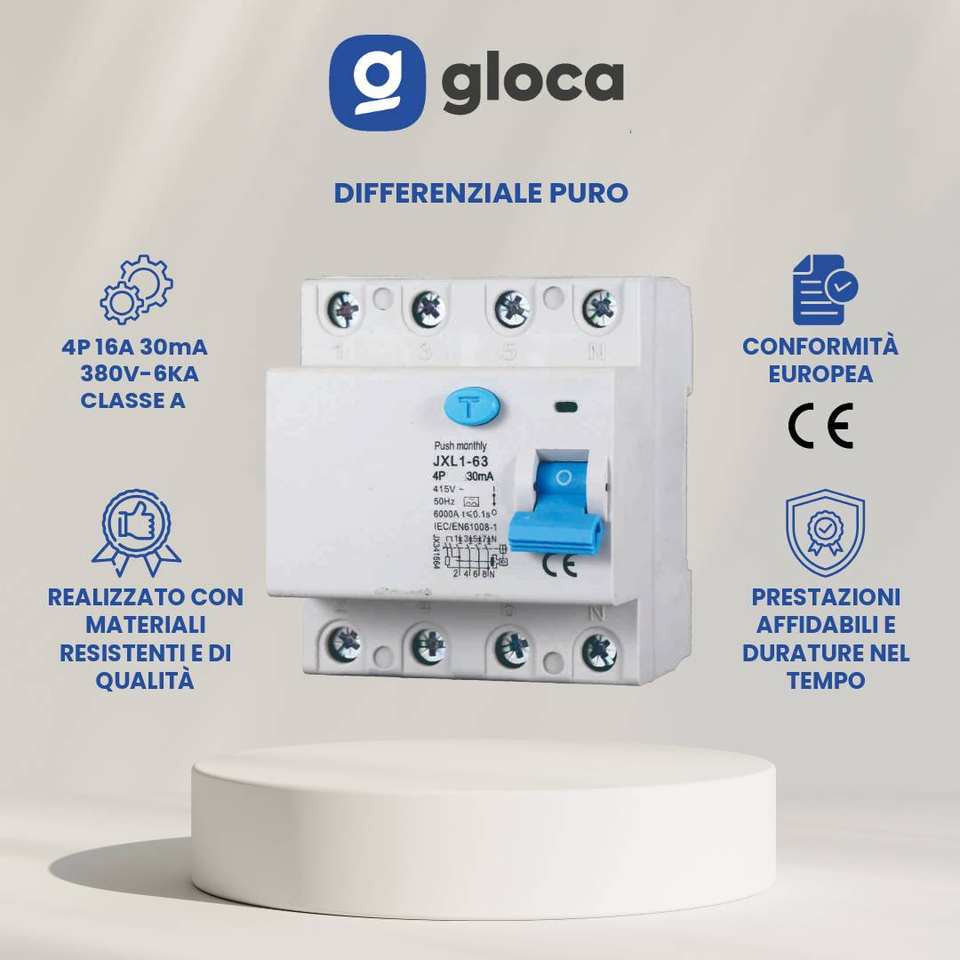 Gloca Pure Differential Switch 4P 30mA 415V 16A Class A DIN Rail Mount JXL1-63