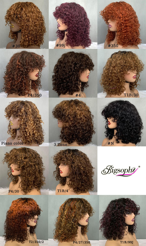 Parrucca Bob Corta Brasiliana Senza Colla con Frangia, Parrucca Ricci Lussuosa con Frangia, Parrucca Ricci Economica con Frangia in Capelli Umani, Parrucche in Capelli Umani Senza Rete