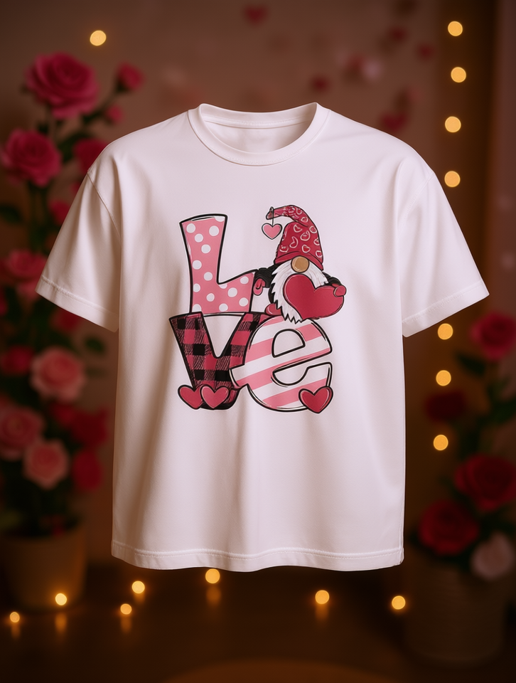 T-shirt da donna con motivo a cuore Gnome, per San Valentino, casual, a maniche corte, girocollo, in tessuto jersey bianco con stampa leopardata