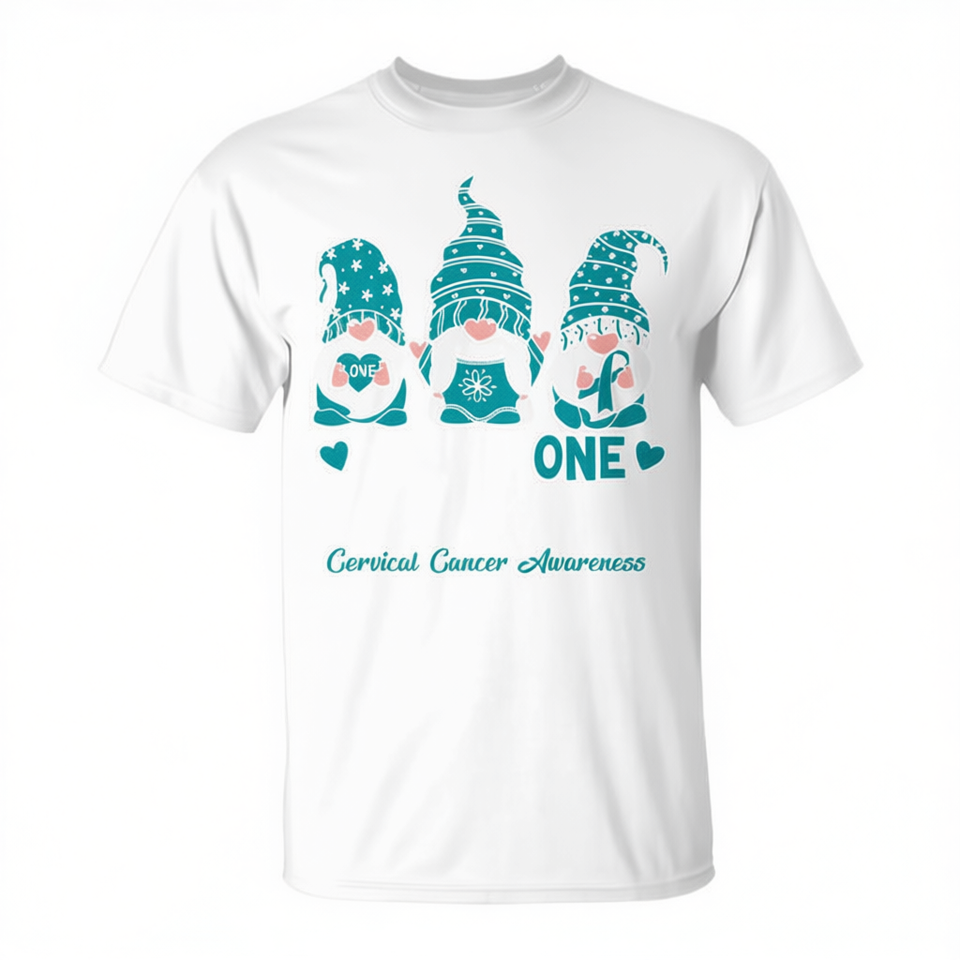 T-shirt Gnome One Fights Alone con nastro verde acqua, abbigliamento promozionale per la sensibilizzazione sul cancro cervicale