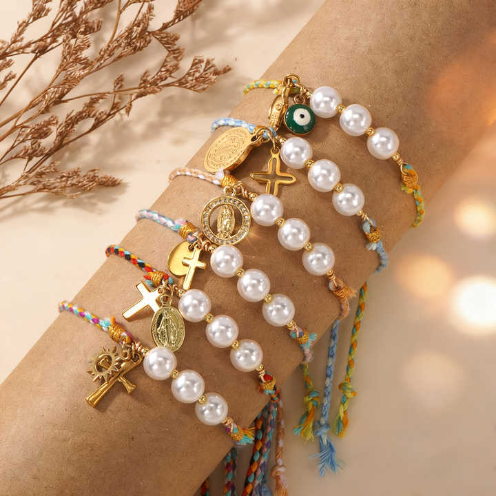 Go2boho Religious Pearl & Charm Braided Bracelets Spiritual Christian Jewelry Set for Women, Protective Faith Accessories