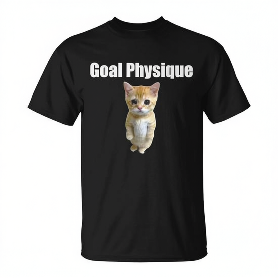 T-shirt Goal Physique Cat Meme nera unisex per adulti, girocollo, manica corta, stampa digitale
