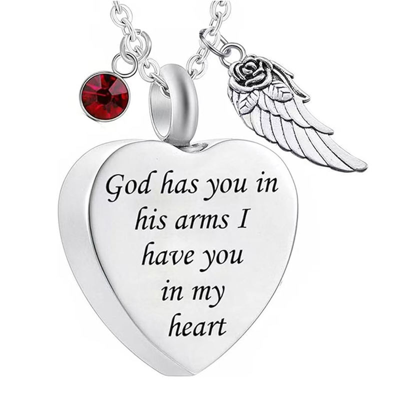God Has You in His Arms with Angel Wing Charm Cremation Ashes Jewelry Keepsake Memorial Urn Necklace with Birthstone Crystal